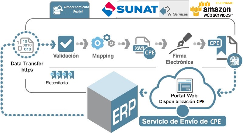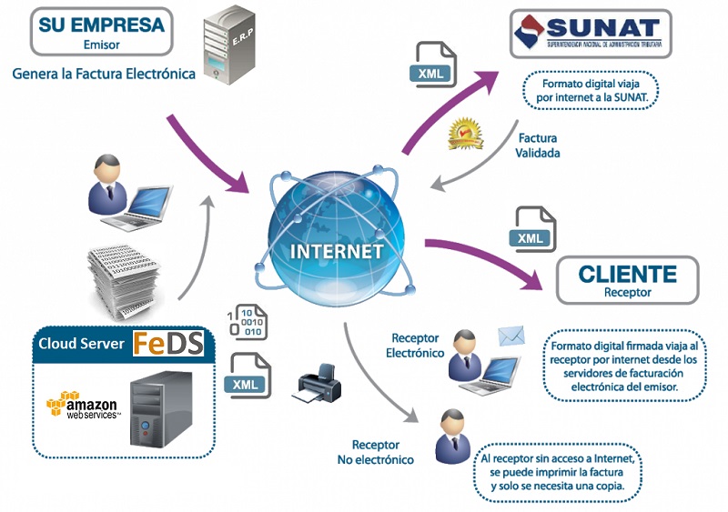 La plataforma de facturación electrónica comercializada por Easy Soft Perú S.A.C. está adaptada a las necesidades del sistema tributario del Perú, conforme a lo dispuesto por la Superintendencia Nacional de Aduanas y Administración Tributaria – SUNAT. Nuestra oferta se basa en dos tipos de servicios: On-Premises (instalado en el cliente) o Cloud (instalado en la nube). Nuestra solución de facturación electrónica para Perú está diseñado para gestionar los comprobantes de pago electrónicos (CPE) mediante eficientes tecnologías de integración de datos y enfocadas en el standard Europeo Oasis UBL adoptado por SUNAT, permitiendo la automatización del proceso de emisión, envío y recepción de facturas electrónicas a partir de los registros generados en su ERP o sistema back office.
